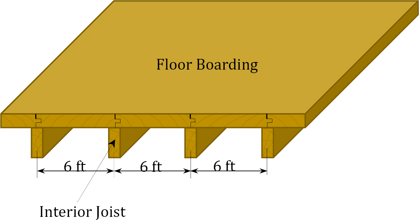 A floor system consisting of wooden joists spaced 6 ft apart on the center and a tongue and groove wood boarding, as shown in Figure , supports a dead load (including the weight of the beam and boarding) of 20 psf and a live load of 30 psf. Determine the maximum factored load in lb/ft that each floor joist must support using the LRFD load combinations.