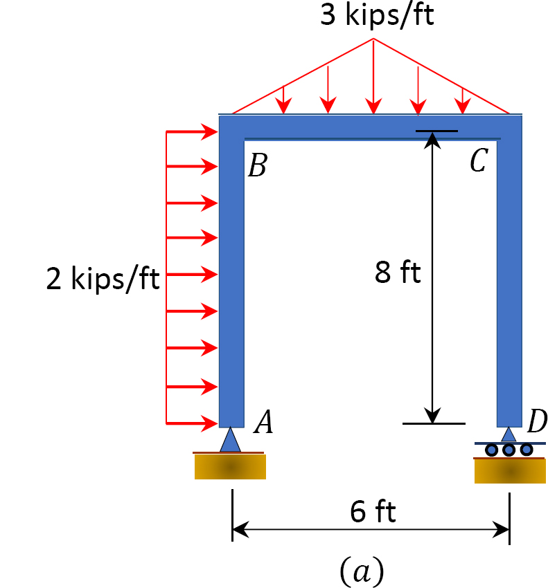 Computation of reactions. The distributed loads in column AB and beam BC are first replaced by single resultant forces determined as the area of their respective shade of loading, as shown in Figure . Applying the conditions of equilibrium suggests the following: